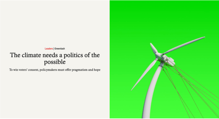 "If a target is so hard that it cannot win consent, then it needs to be changed. But how? For rich countries to abandon stringent net-zero targets outright would demoralise greens, energise climate nihilists and make sensible reforms harder. Better to find ways to ease them into the “more of a guideline” category. There will be resistance from those who believe that all problems can be solved by “more political will”, but as a famously iron-willed German once said, politics is the art of the possible." - writes the Economist.